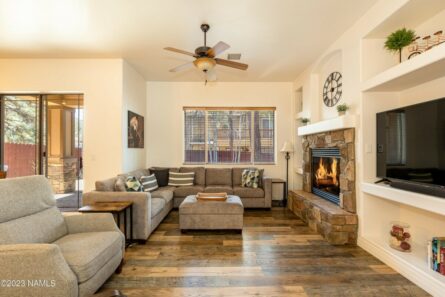 The shining star of Pinnacle Pines! This is the perfect home for family, guests, privacy, entertaining and enjoying the best of Flagstaff’s natural beauty. First, there is a private bedroom and full bath on the entry level. The signature open kitchen and greatroom with 10′ ceilings is upgraded, has a fireplace and views of the lush , treed yard. The spacious primary suite is private, on a level of its own. Upstairs are two additional large bedrooms and a full bath. This beautiful townhome has room to live, play, entertain and work. The landscaped backyard is absolutely gorgeous. Enjoy the cool pines, aspens & peak views. Meticulously maintaned by its owners, this home is move in ready.