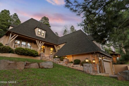 Live in an extraordinary, storybook-like custom home in the heart of downtown Flagstaff, surrounded by a .5 acre forested homesite that transports you into timeless beauty. From its stunning Tudor curb appeal to the panoramic view from Inspiration Point, the highest point of the yard, this home is uniquely enchanting. Enjoy the open kitchen with new appliances & greatroom with cathedral ceilings, cherry wood floors, beautiful wood beams & a stone fireplace, with light dappling across the walls through the skylights and the trees. The second living area with cherry floors & beam accents, & an upgraded primary suite on the main make this the perfect floorplan. The yard is a unique, private, lovingly curated magical forest with bountiful trees, jutting rock formations, trails & gardens.