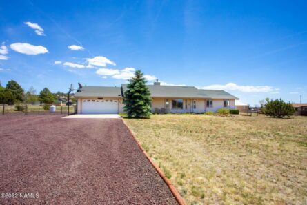 Amazing equestrian property in Doney Park with breathtaking views of the San Francisco peaks and Mt. Elden. This single level split floorplan home is located on a fenced 2.5 acres. Enjoy the views of the peaks from the comfort of your living room! Living room features a built-in barn wood entertainment center, wood burning stove, and vaulted ceilings in an open floorplan. This ideal horse property includes a 20′ x 30′ barn with a tack room and two stalls, two additional horse shelters (giving enough room to easily keep 6 horses), and a 75′ x 120′ arena. There is also easy access to the forest through the back of the property. All of this is located just minutes from town!