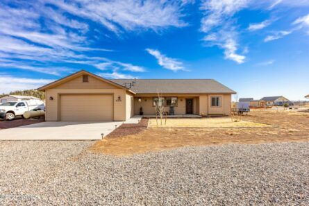 Like brand new, immaculate, and upgraded 3 bedroom home on 2.5 acres with views of the Mountains. Built in 2018, this move-in ready home on a quiet, private street is a gem in Doney Park. Bright and light and beautifully constructed with superior quality finishes throughout: luxe laminate floors, wood, soft-close cabinets with upgraded hardware, upgraded fixtures and lighting throughout, gorgeous granite counters & kitchen backsplash, 4.5” baseboards and central AC! The garage is a Doney Park dream with an 8′ door that fits oversized trucks. Enjoy gorgeous views of the peaks from your great room. Outside, irrigation is set with drip system and sprinklers. This home is on Doney Park water.